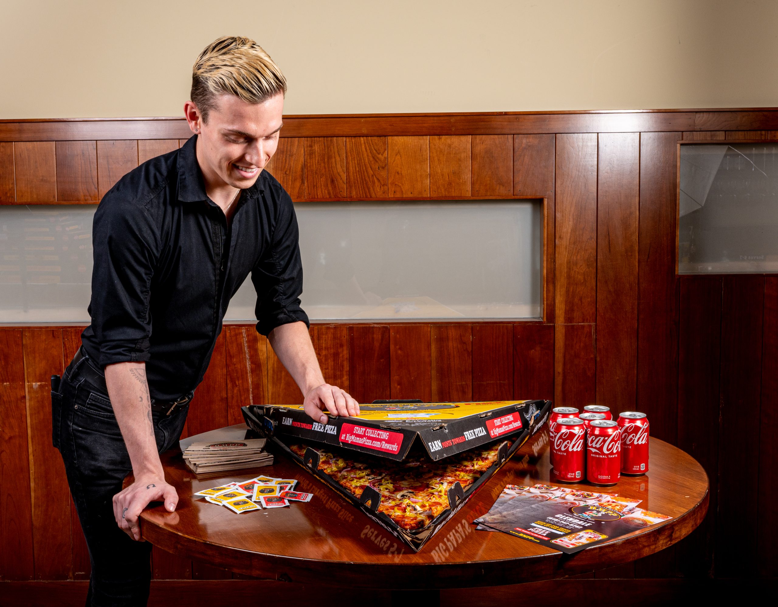 Menu items include classic and specialty pizzas, sandwiches, salads, pasta, and desserts. BMPP locations also offer catering, in-house delivery, and partnerships with select third-party platforms.